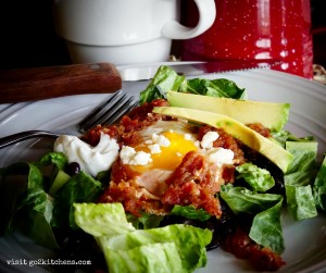 add salsa and bring to a low bubble, medium heat should work. Careful not to scorch salsa. Once salsa is bubbling make 4 wells by moving salsa aside in an area, exposing the skillet bottom. Crack egg 1 egg into each well that you have made in salsa. You will have to work fast. The goal is to get a poaching effect with the egg in the salsa. Cook until egg whites are stiff and no longer translucent. Egg yoke should be firm but runny when cut. To serve, form layers as follows; tortilla, beans, lettuce, salsa and egg mixture. Serve hot! Options: service with fresh avocado slices, serves with guacamole, sprinkle with feta cheese, or sprinkle with chopped fresh cilantro.